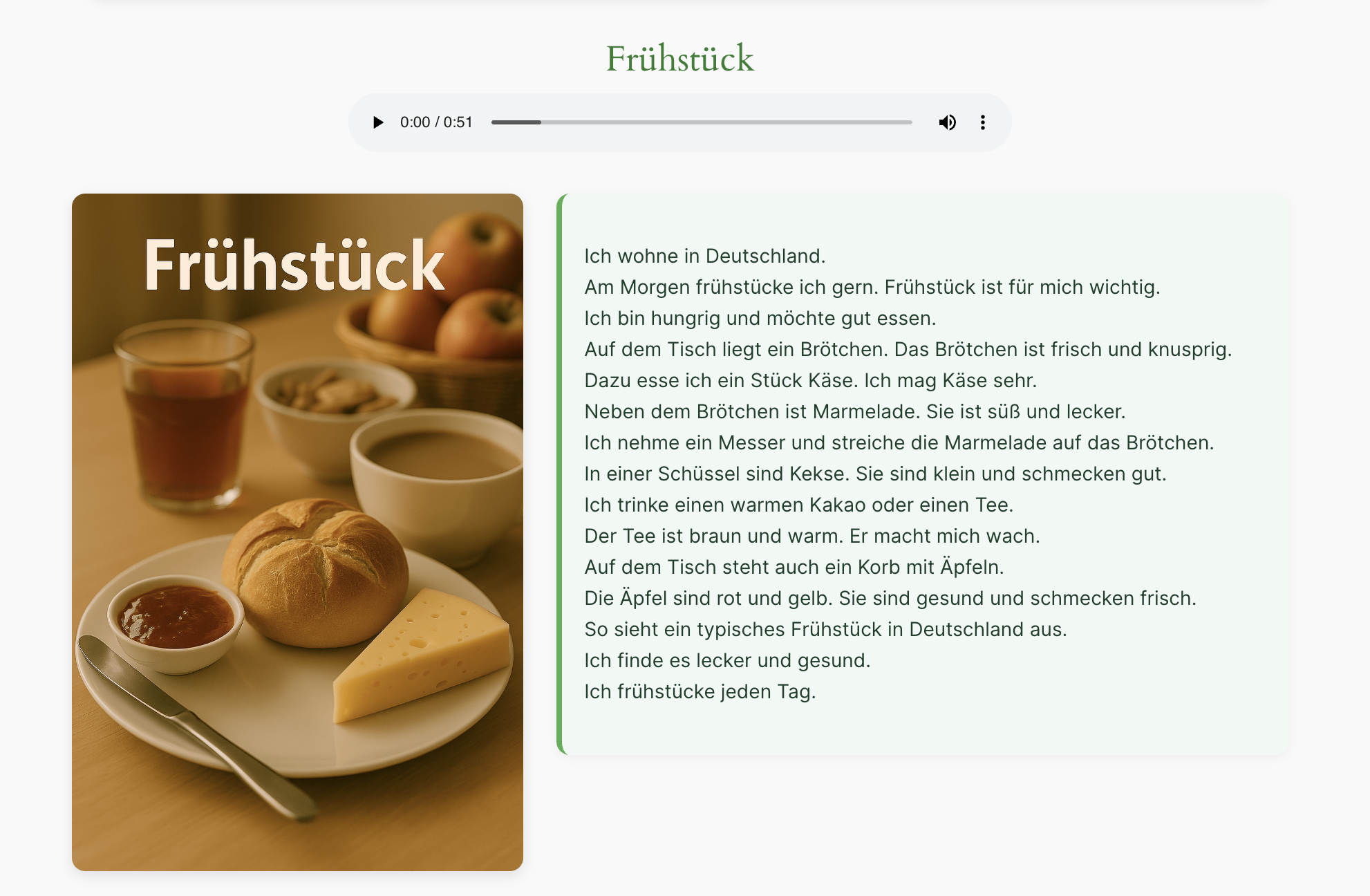 Einfache Texte rund ums Essen: Brot, Käse, Wurst und Soße – ideal zum Einstieg ins Lesen auf Deutsch.