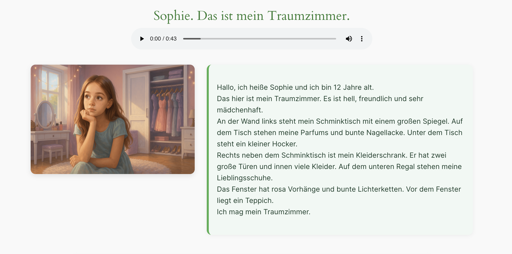 Rechts neben dem Schminktisch ist mein Kleiderschrank. Er hat zwei große Türen und innen viele Kleider. Auf dem unteren Regal stehen meine Lieblingsschuhe.