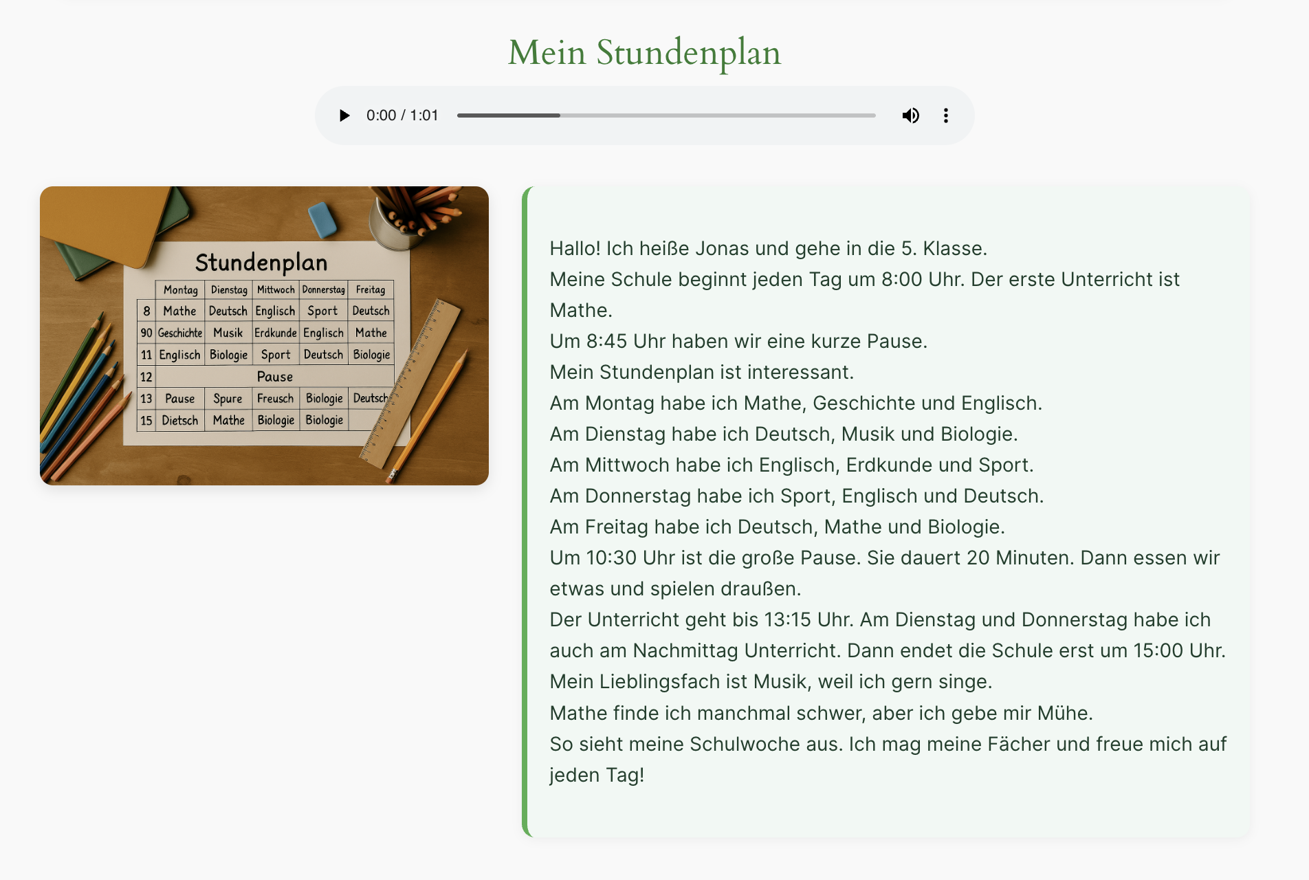 Meine Schule beginnt jeden Tag um 8:00 Uhr. Der erste Unterricht ist Mathe.