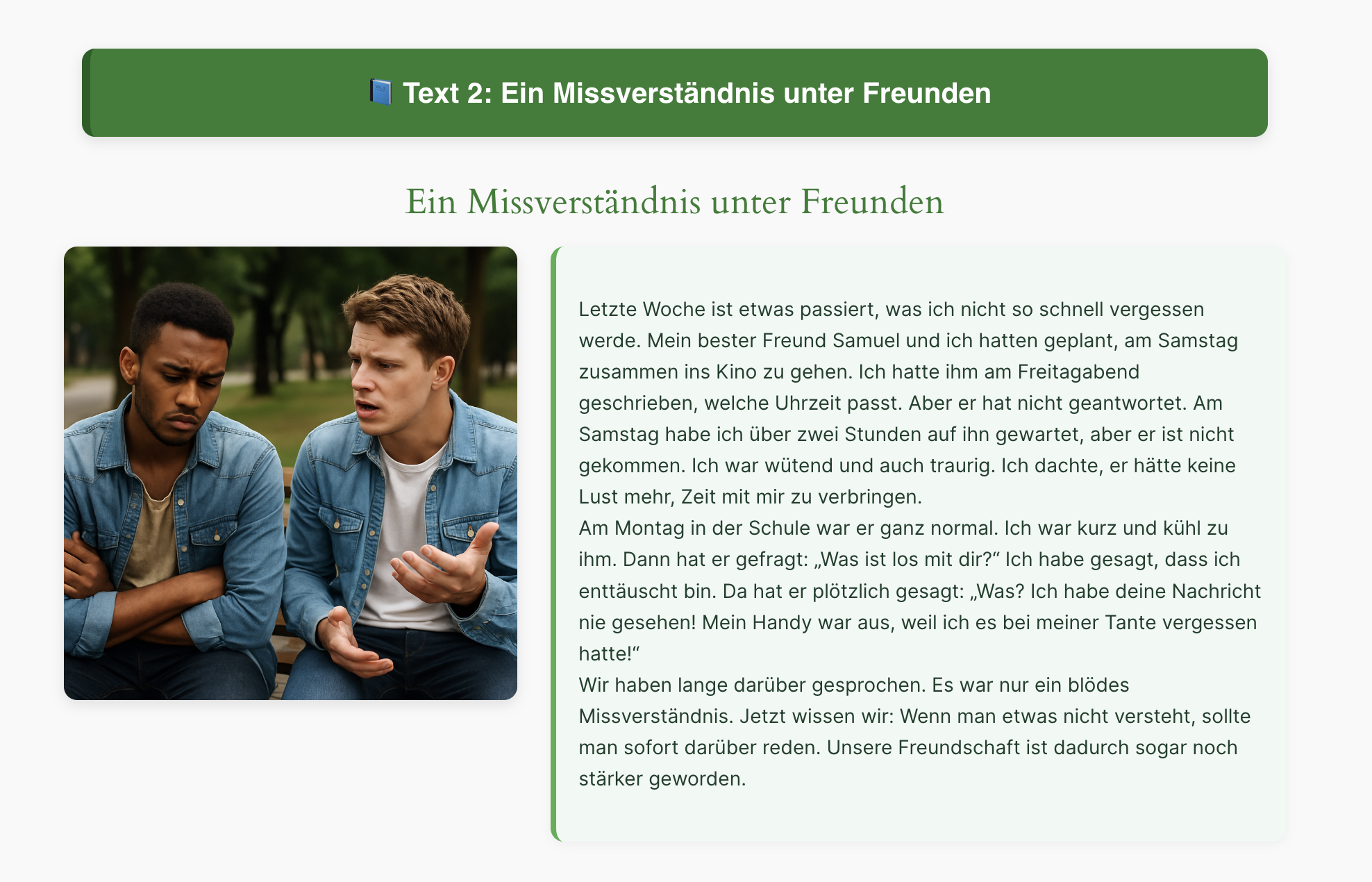 Kurze Lesetexte zum Thema ‚Freundschaft und Gefühle‘ – perfekt für Deutschlernende auf A2‑Niveau.
