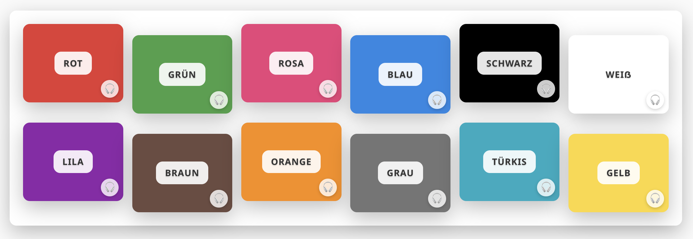 Auf dieser Seite lernst du, Farben auf Deutsch zu benennen – von Rot bis Weiß – mit Audioaufnahmen und interaktiven Übungen.